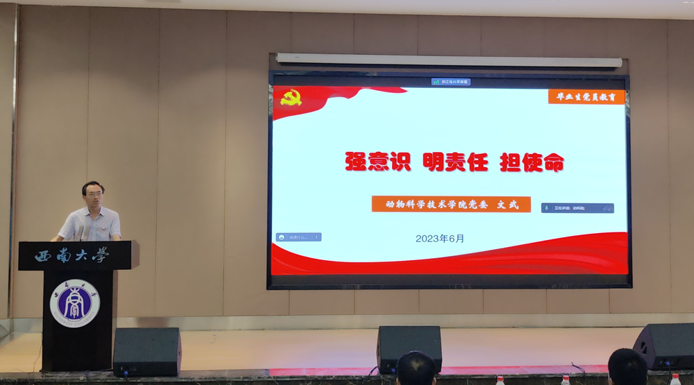 党委于6月2日下午分荣昌、北碚两个会场同步视频召开2023届毕业生党员集中教育大会。党委副书记、纪委书记文武,全体学生党支部书记及2023届毕业生党员参加了会议。会议由组织员贺春湘主持。