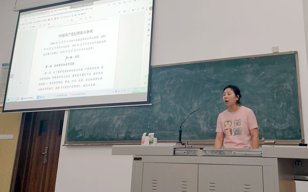 委员会党纪学习教育实施计划》,对支部学生党员党纪学习教育工作进行部署与安排;领学了《中国共产党纪律处分条例》总则内容。