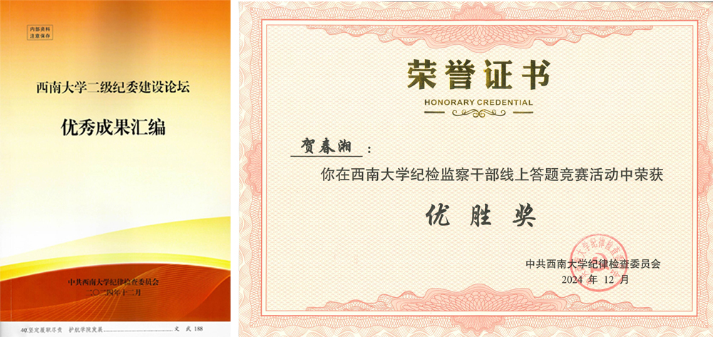 纪委委员、组织员贺春湘荣获学校纪检监察干部线上答题竞赛优胜奖;本科生三支部选送的《守廉心,树新风》荣获廉洁教育系列活动“视廉清心”视频征集类二等奖;本科生三支部叶松的《清廉立身,共筑未来》、本科生二支部胡聪的《让廉洁之花在青春中绽放》荣获“话廉润心”校园征文类一等奖,研究生一支部张馨月的《以廉修身,树清风正气》、本科生二支部李宁波的《日常生活显廉洁》、周静萍的《扬廉洁之风,聚清风之气》荣获“话廉润心”校园征文类三等奖。