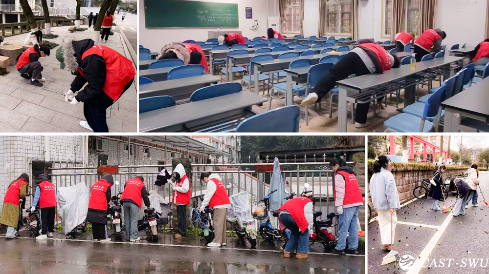 志愿者们分组开展志愿服务活动,他们通过摆放校园内自行车、清理教室内卫生和清除校园过期活动广告等来营造整洁有序的校园环境。活动中,志愿者们干劲十足、不怕辛苦,用实际行动诠释着新时代雷锋精神。