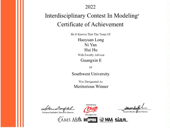 2019级本科生龙昊源、晏妮组成的团队参赛作品《TEV forest management model based on BEF carbon sequestration》荣获一等奖奖(Meritorious Winner)。