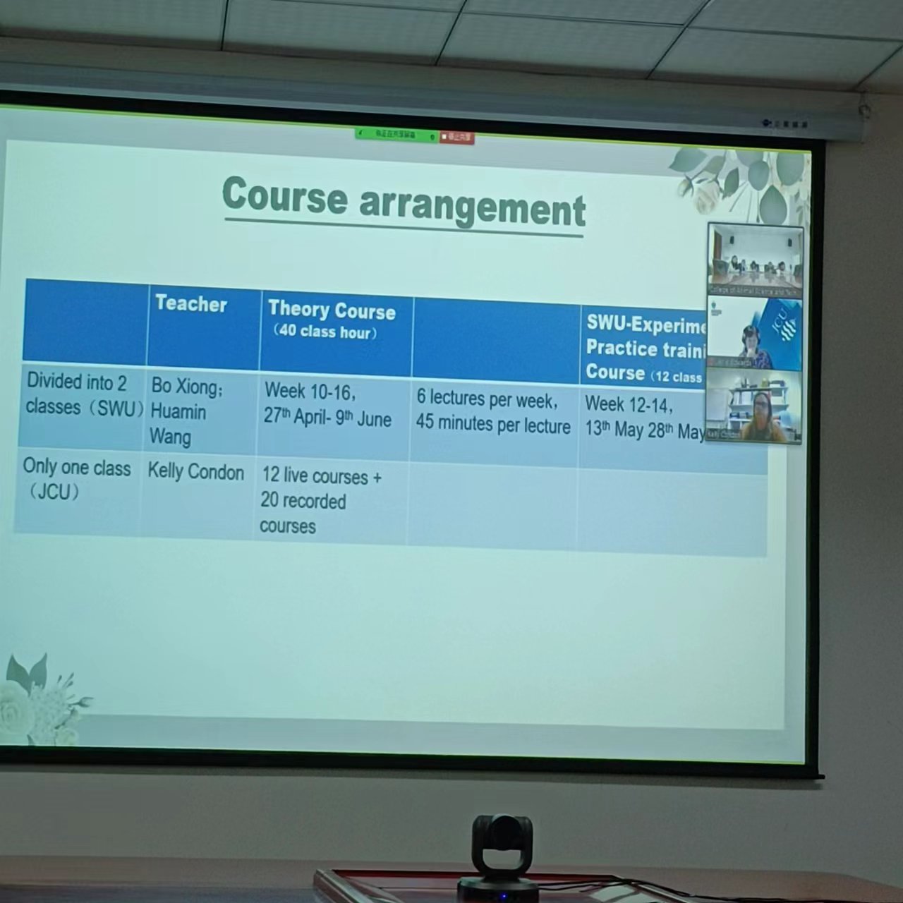 的肖雄教授分别介绍了各自课程的情况,并与JCU的授课老师就课程大纲、考核指标和开设时间等具体问题进行了深入讨论。本次会议为新学期课程的良好运转打下了坚实基础。