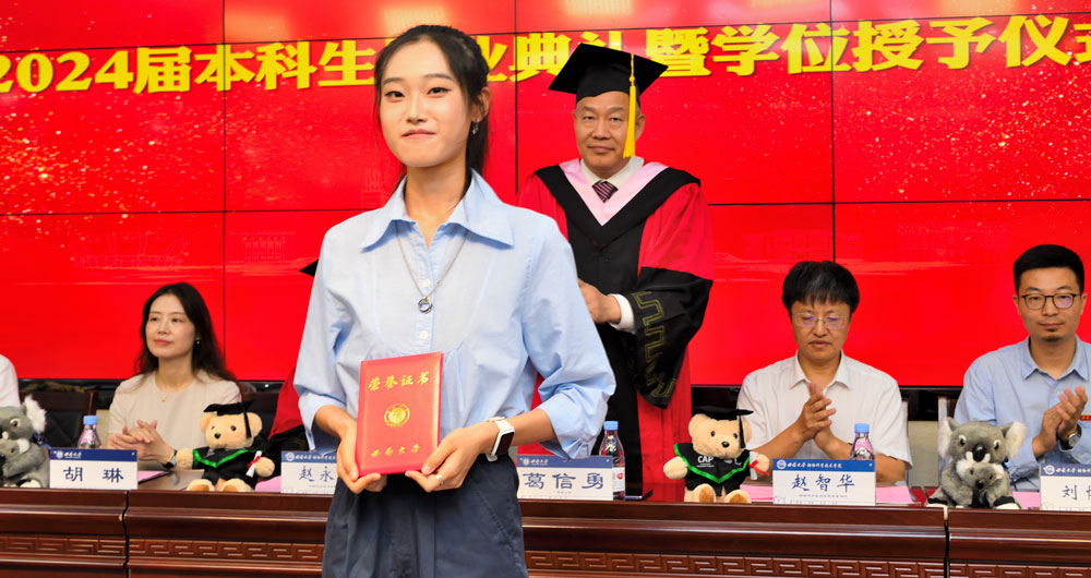 仪式在庄严的中华人民共和国国歌声中正式开始。向钊宣读《西南大学关于准予2024届本科生毕业的决定》,毕业生代表上台领取毕业证书。赵智华宣读重庆市和西南大学表彰文件,主席台就座的领导和嘉宾为重庆市优秀本科毕业生代表、学校优秀本科毕业生代表颁奖。赵中权宣读《西南大学关于2024年春季学期学士学位授予的决定》,葛信勇副校长和澳门六合彩开奖结果查询