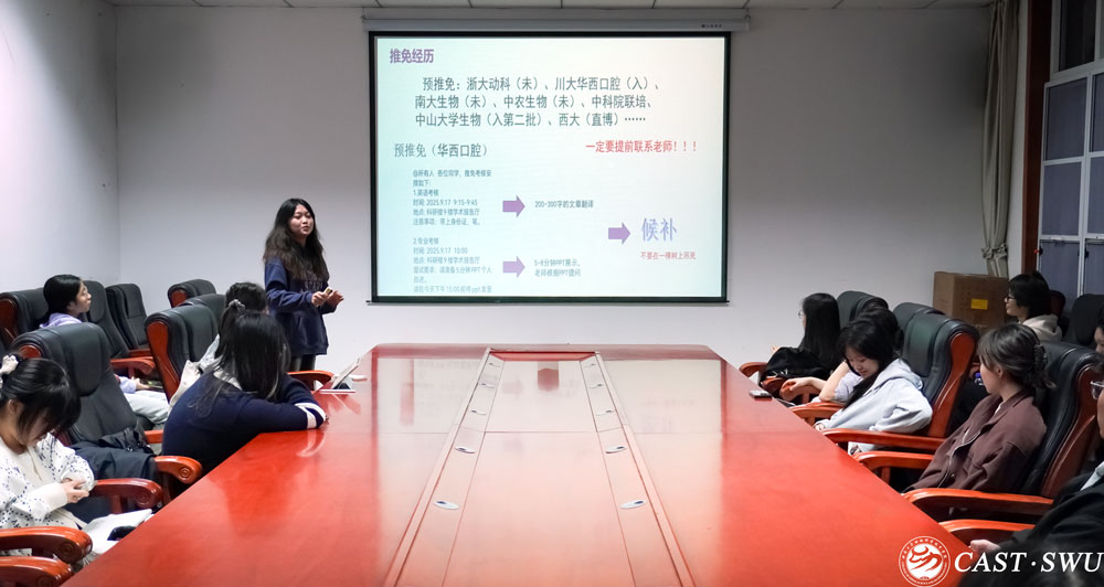 于10月31日在37-219与32-210教室顺利举办2025年保研经验分享会。本次分享会邀请到本专业2022级8名成功保研至国内知名高校的优秀学生代表,围绕院校选择、材料准备、面试技巧、科研经历等方面展开交流,吸引了2023级诸多同学积极参与。